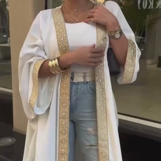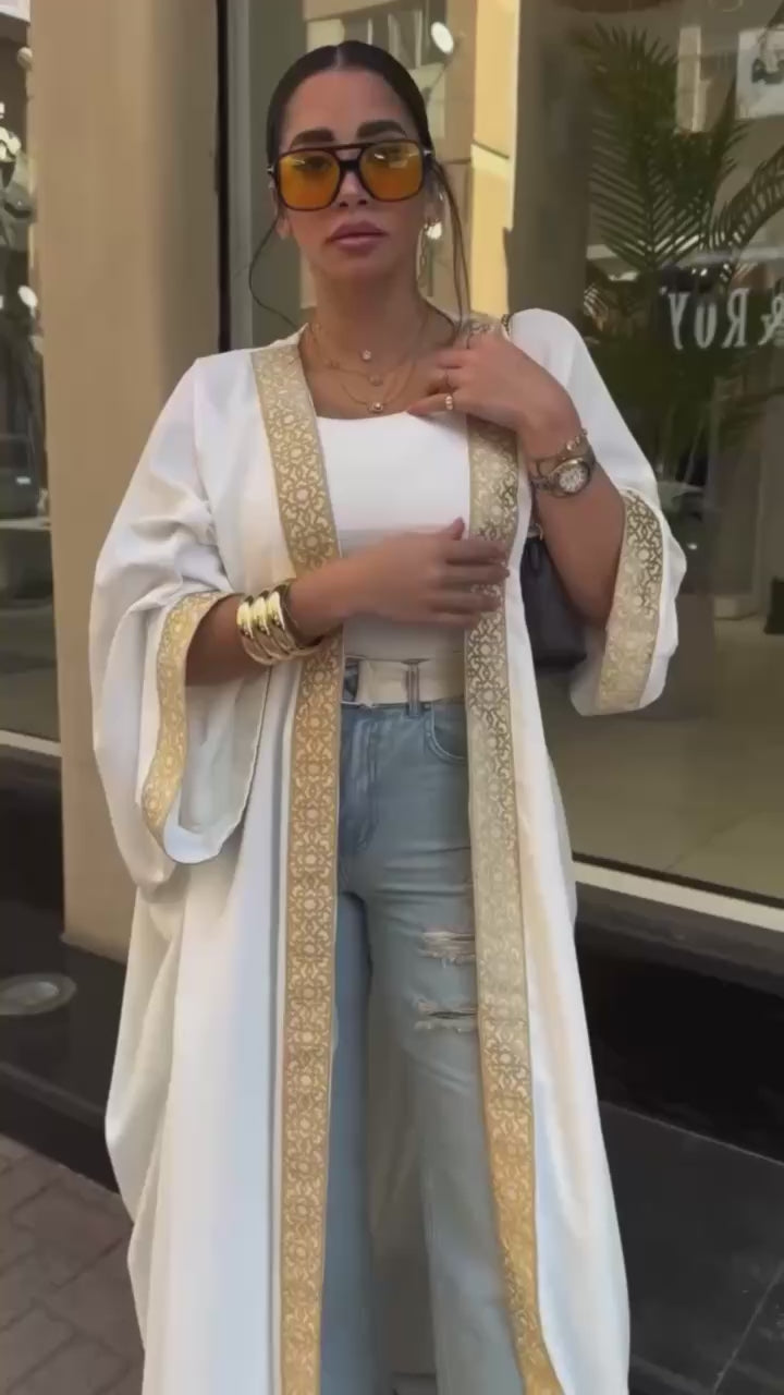 تألقي بإطلالة راقية تجمع بين الفخامة والعملية مع هذه العباية المميزة بتطريز ذهبي أنيق على الأطراف والأكمام. تصميمها المفتوح يمنحك حرية تنسيقها مع مختلف الإطلالات، سواء الكاجوال مع الجينز أو الإطلالة الرسمية في المناسبات